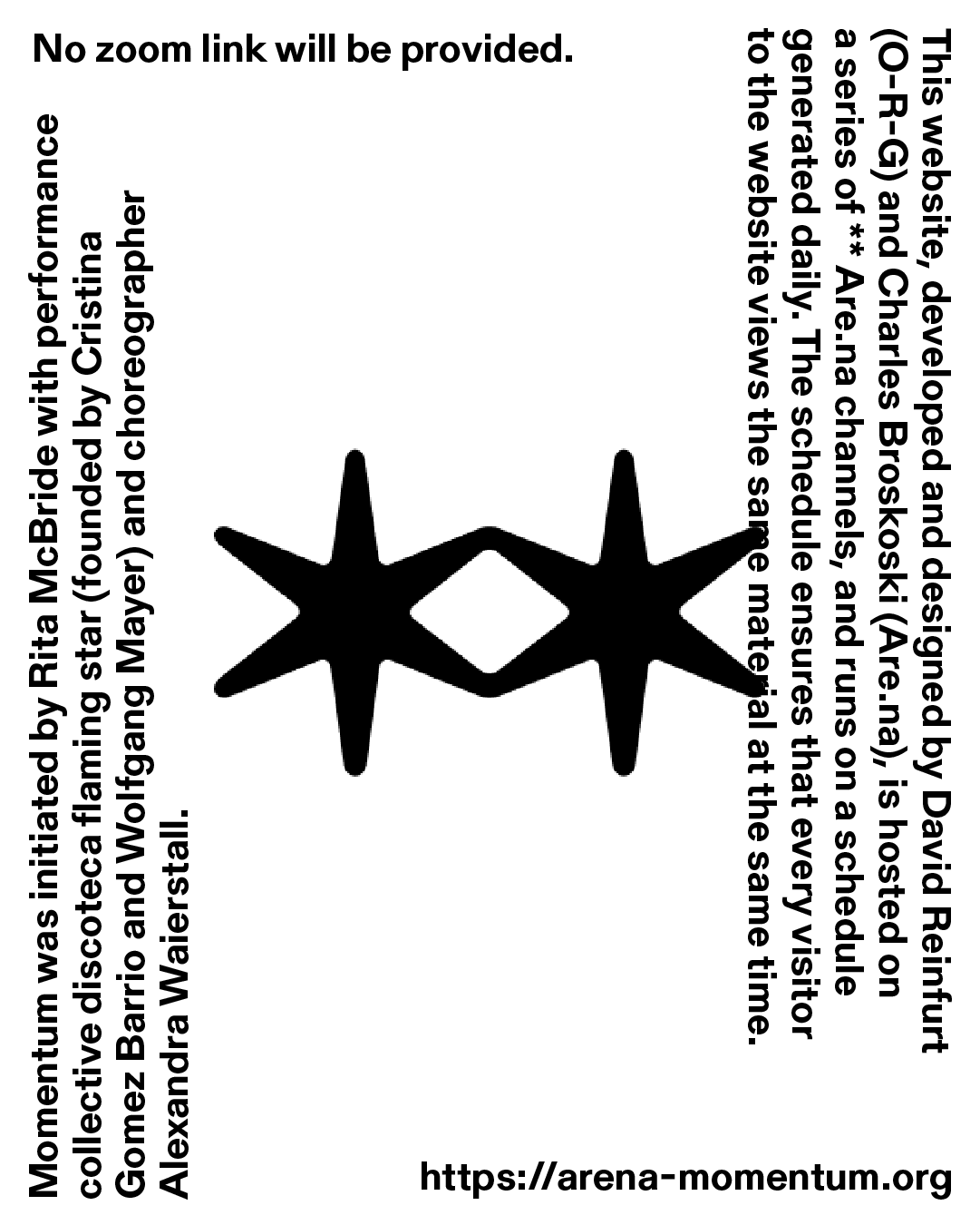 to mark the launch of arena-momentum.org, a live/archive website which grows out of Arena Momentum, two years of events at Dia Beacon which ran inside of and parallel to an exhibition of the same name by Rita McBride. Momentum was initiated by Rita McBride with experimental performance collective discoteca flaming star (founded by Cristina Gomez Barrio and Wolfgang Mayer) and artist and choreographer Alexandra Waierstall.