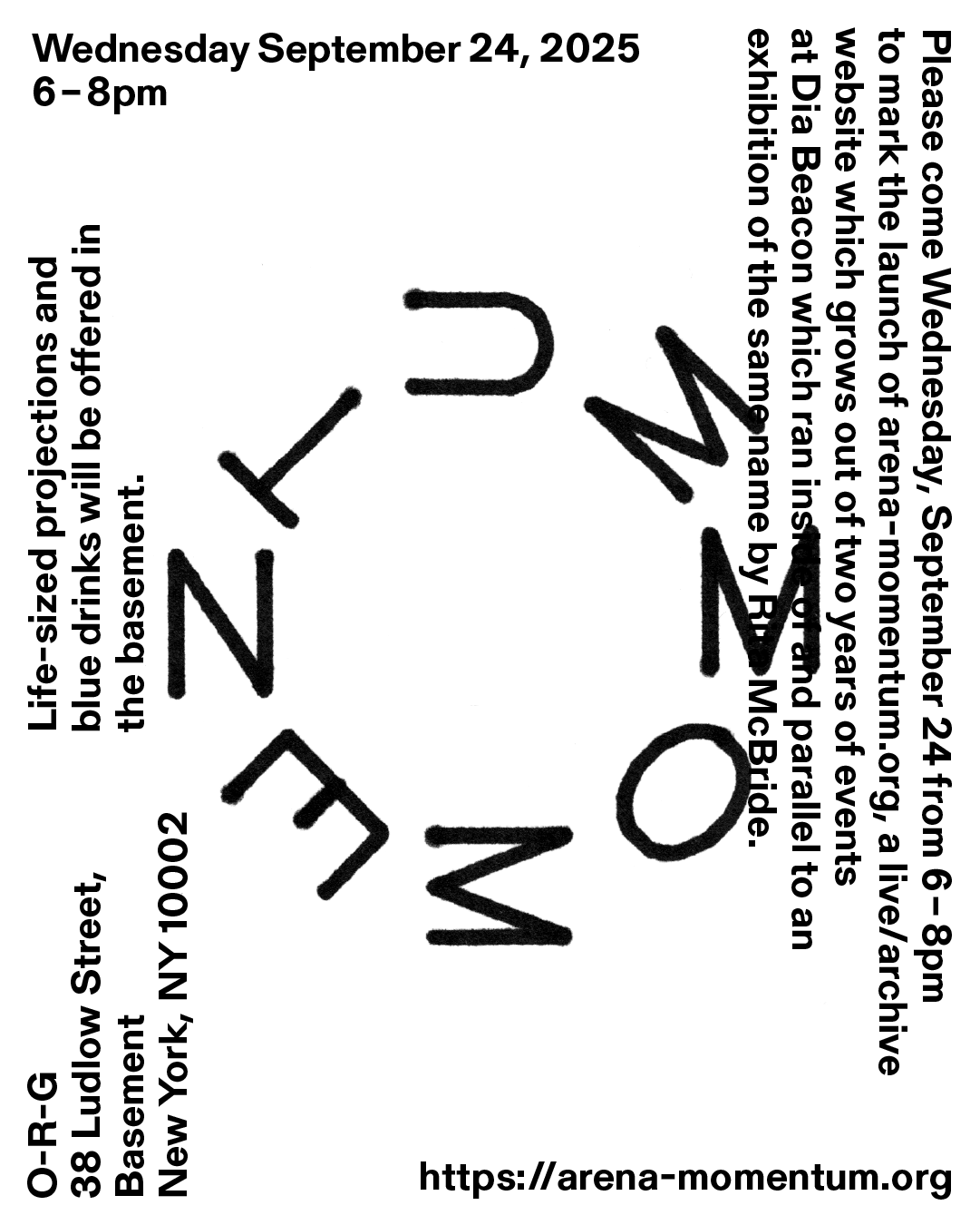 to mark the launch of arena-momentum.org, a live/archive website which grows out of Arena Momentum, two years of events at Dia Beacon which ran inside of and parallel to an exhibition of the same name by Rita McBride. Momentum was initiated by Rita McBride with experimental performance collective discoteca flaming star (founded by Cristina Gomez Barrio and Wolfgang Mayer) and artist and choreographer Alexandra Waierstall.